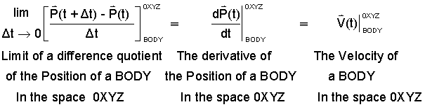 To think of something, to suppose something exists at an instant on Earth so short as to be "zero length in time:" such is certainly an abstract idea. Newton called this abstract idea related to physical reality of a BODY, the velocity V(t*) of the BODY at time t = t*. Each of the three notations below is identically and completely equal to the other two. All three notations mean velocity of a BODY in 0XYZ-space.