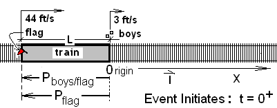 Event State upon Initiation: The sketch depicts the boys (moving with speed, 3 ft/s) with the train immediately abreast and moving past them. Its speed is 44 ft/s. This instant shown is the starting time of our event.