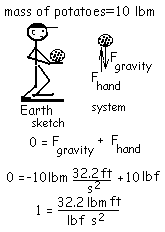 Thus to support or carry ten pounds mass of potatoes (in uniform motion) a person must exert a vertical force of ten pounds force. When we apply Newton's 2nd Law to the event of uniform motion (in the vertical direction, 0 = ΣF) a necessary identity among units (for potatoes and everything) results.
