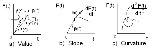 A basic idea of calculus is that a function, F(t), has three characteristics at any specified value of t, say x = x*. Associated with x* the function has a a value, a slope and curvature. These ideas are illustrated in the sketches below.