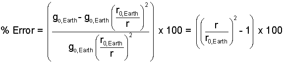 The percent error of using the constant, surface-value of gravity up to some elevation r, is written below then algebraically reduced. approximation that a constant (surface value) for the acceleration of gravity for all elevations (of altitudes) reduces algebraically to: