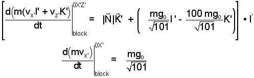 We proceed carefully by writing the normal and gravity force vectors in component form (above), then placing them in the momentum equation (second law) below. Motion involves the "up or down hill" the I' component. Hence we scalar multiply by the vector direction - I'. Recall that I' • I' = 1 and I' • K' = 0.