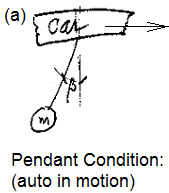 ♦ Vehicle Accelerated In this case a mass hangs on a cord attached to the rear-view mirror of an auto. While stationary, the cord alignment is vertical. Moments later the auto is in motion. Sketch (a) shows a condition of the pendant during motion.