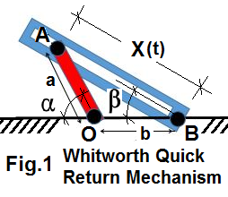 The mechanism O-A-B has two links and ground. The input, Bar-OA, oscillates through small angles, α ± Δα. Bar-AB, slot-connected to Bar-OA at A, has a changing, active length, X(t). Figure 1. is the basic configuration with notation. Write a general "specification" for all positions of this planar mechanism. Use a math/physics approach that leads to a solution statement readily expressible in computer code.