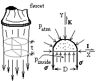 It will not be proved here, but if the interface is flat, there is no pressure change. However, for spherical droplets in air and for the very small diameter jets of water (as with of cutting machines) in air, the pressure of water inside its substantially greater than atmospheric. Consider water that issues downward from a faucet.