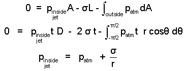 The surface tension of water (σ) is very small. Thus, the pressure change across the air to water interface of a jet equals zero except for jets of very small diameter as with water jet cutting tools.