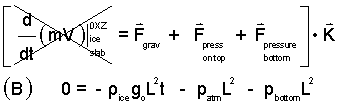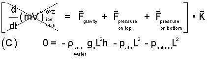 For more information, the momentum equation is applied to a section of ice slab in its initial, floating state. The sketch (right) shows the isolated system bounded by its "dotted line." The momentum equation is applied.