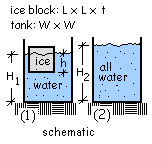 The densities, ρsol and ρliq are known constants and the dimensions, W, L and t are arbitrary. Thus the above equation appears to have three unknowns which are the initial (average) floating depth of the ice slab, h, and the initial and final depths of the sea, H1 and H2. However, we can group the two depth-unknowns together as: H2 - H1.