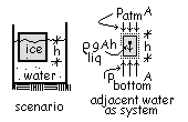 A final available condition is that of static equilibrium of the water adjacent to the ice. The system is shown (right). We write the momentum equation for a column of water of depth h.