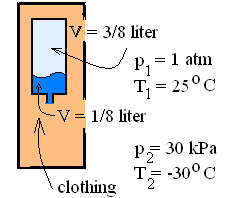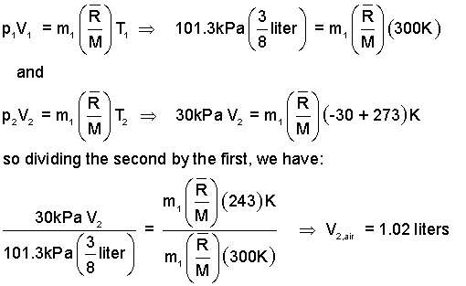 An air-traveler packed a 1/2 liter, 1/4 full, rigid plastic bottle of hand lotion in a "bottom-up" position in her bag with clothing (shown in the sketch). The little spout of the bottle was in the open position but lotions hardly flow at all. The bottle was loaded into the cargo hold of the aircraft which then climbed to 35,000 feet where pressure and temperature were 30 kPa and -30°C. When the plane landed, approximately what volume of lotion will remain in the bottle?