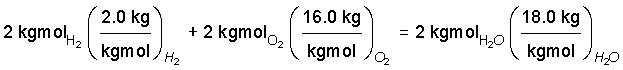 What about the masses of the complete oxidation reaction of a mass of two kilograms of hydrogen? What mass of oxygen is needed and what mass of water will be produced?