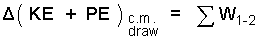 ♦ The system is the material of the span to be lifted. This is all of the wood, nails and such of the span. The span pivots at its hinge. Lifting ropes act at the end of the draw. Our system includes the bridge, the parts of the hinge that move and a short length "lifting ropes." The system cuts through the lifting ropes; the tensile, lifting forces act there. Assume our span rigid and uniformly distributed, model it as an extended body with its entire mass located at its geometric center designated, c.m., on the figure. As always, we write our tool, the energy equation. Then we use it to inspect the event.