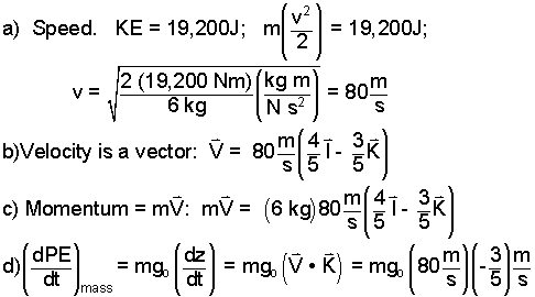 Calculate the speed, velocity, kinetic energy, position as a function of time, potential energy, and position and velocity in 3 seconds (not necessarily in order):