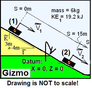 On Planet Gizmo a small block was observed, State (1), sliding down an inclined plane. A "down-the-plane" coordinate, "s", was imagined with the block at its origin, s = 0 at the time, t = 0+. The mass of the block is: m = 8kg. Initially the elevation of the block and its its kinetic energy were: zB,1 = 6m and KEB,1 = 4J, respectively.