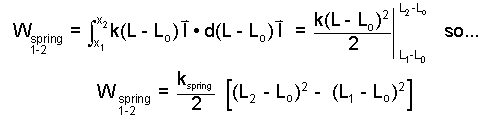 The sketch shows a coil spring with its left end immovably attached. The spring can move without friction on the horizontal plane. Its length without load is Lo. For the spring to be extended, the force must be directed to the right, positive I direction, and the displacement will also be positive. Such work is positive and is reflected by an increase of internal energy of the spring. The magnitude of the force increases in linear proportion to the distance of extension. Conversely, to compress the spring from the initial length, L = Lo requires a negative force that acts through a negative displacement and the spring internal energy increases again. General integration determination of spring work is as follows.