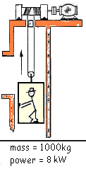 An elevator operates by cables, pulleys, an 8kW electric motor and controls. Assume the elevator operates with no power lost to friction.
