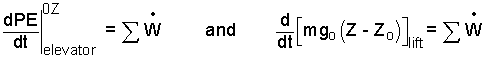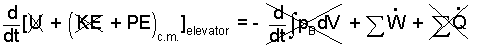 To the right, across the equality, the atmospheric work term, - d(∫dV)dt, is zero because the volume of the elevator (system) does not change. (Bypass ΣW for now). The sum of heats for the event is assumes zero at the beginning of the event and there is no motive for heat change thereafter; ΣQ = 0.