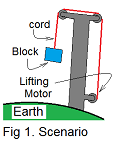 S-1: describes a scenario: ... a block moves upward at constant speed by pull of a cord. Gravity force opposes the motion. We assume some manner structure with a "lifting motor" to power the event. Analysis generally begins from the vantage of a physical secnario approximated by a sketch - The scenario - Figure 1.