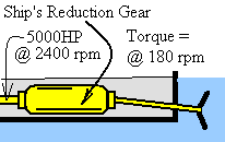Marine power engineers must design a reduction gear for each ship. The power of the turbine must be pass from the gast turbines (at the turbine rotational speed) through a reduction gear (a set of lubricated, cooled gears) to arrive at the propeller shaft with its power intact but a greatly reduced rotational speed. The gear changes the characteristics of power from "low-torque at high rpm" to "high-torque at lower rpm." The rotation rate is reduced and the torque of rotation is increased. These gear boxes are essential but inefficient. Our sketch shows the reduction gear of a gas-turbine destroyer in operation. Use the information of the sketches to answer: