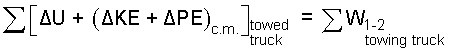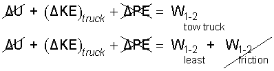 The initial and final potential energies of the truck are zero. Next consider the summation works. The tow truck will supply power to the truck through the displacement-rate of its towing-force. Some of this power will pass through the truck to the surroundings, and some of it will come to reside within the truck components (as increased internal energy). Some will be energy as work by the work of the tow, and work of friction. Potential energies are negligible and the work of the event can be expressed as an integral: