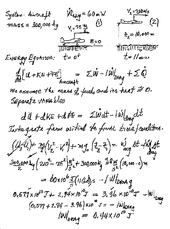 An airliner of mass 300 tons is powered by four engines each of which develops a steady power of 15,000 kW. The take-off speed of the aircraft 75 m/s. The aircraft requires 11 minutes to attain its cruising speed of 210 m/s at an altitude of 10,000 meters.