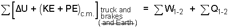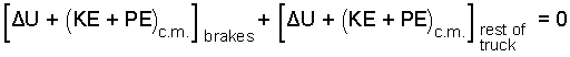 With work, stopping forces will occur where the tires meet the road, but assuming the truck does not slide, those forces are not displaced and there is no work. Seen in another way, the tires do not tear up the road - hence no work. Also, with this first calculation we assume the truck is traveling with the wind so there is no wind drag and no work associated with wind forces. Hence, in our equation, for the event, both work and heat are zero.