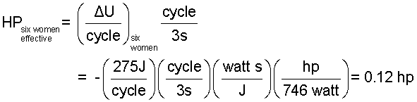 ♦ We defined the system to be the six women, the ropes and the stump; taken together. The steady "horsepower equivalent" of the compactor will equal the average rate of energy expenditure of the women which will occur during the lifting portion of each cycle. There is no work for this effort because the women, ropes and stump are interior to the system. The women will perspire but we assume the heat to be small. The rate-form energy equation reduces as follows: