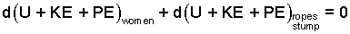 The kinetic and potential energy changes of the women are negligibly small and the internal energy of the ropes and stump will change, inconsequentially, with each event.