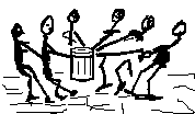 The sketch depicts a circle of six women operating a dead-weight compactor which was no more than a short, dense tree stump banded by a steel strap to which six ropes were attached. Leaning back in unison, each woman would pull her rope and all pulling together, the stump would be hoisted from the ground, chest high then let to fall, slamming into the ground to pack the loose earth tighter.