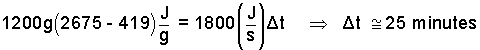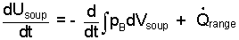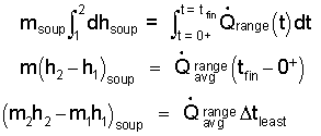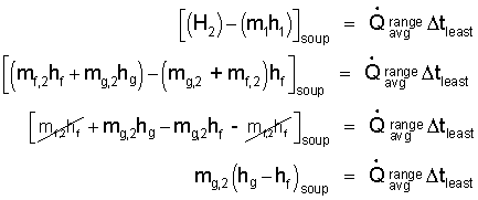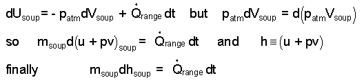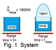Above, the "heat" of the soup some that "arrives" from the range some that "leaves" passing from the boiling water into the surrounding kitchen space/air. At our level of study, the heat from the water to the kitchen cannot be calculated. Consequently we must assume this amount of heat is "small or zero;" we strike it out (/). Yet by neglecting this heat (which is not zero) we realize the answer we obtain will be the "minimum" time for the event. Our energy equation is: