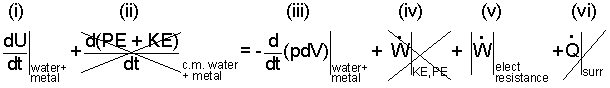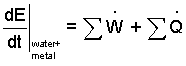 Discussion and Solution: We take the system to be the water and the pot - its metal. We begin by writing the energy equation in a first, implicit, or skeletal form. There are three terms. At any instance in time, the rate change of energy (of the water and teapot) equals the sum of work rates applicable plus the sum of heat rates applicable. The implicit equation for these materials as they sit on the table and as they operate (once initiated) is: