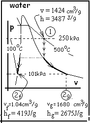Yardley used a spherical vat with hot high-pressure steam to render animal bones into glue. The vat was filled with bones, fat and cartilage. Steam was admitted to purge the air, then the vat port cover was pulled snug. Next the vat was charged with steam to 250 kPa and 500°C then rotated slowly. It usually took about an hour for the steam to cool until the pressure in the vat became one atmosphere whereupon the port cover would pop open. Then the glue was drained into the sump and the process was repeated. The first time this cycle is performed nearly none of the bone dissolves so the "glue" is nearly pure water. Data for water are given with the p-v sketch.