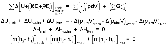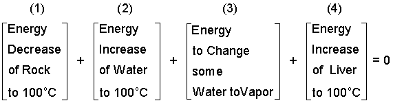 ♦ We take the rock, water and liver (approximated as an equal mass of water) as system. Ignore the thermal effects of the paunch. A precise second temperature cannot be determined because there will be heat to the cold atmospheric surroundings. The best we can do at this level is to approximate the event as adiabatic and calculate the greatest possible second temperature of the liver and water. There will be negligible kinetic and potential energy changes. The energy equation and its reduction for this event is: