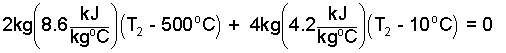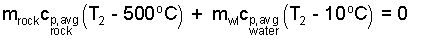The second temperature will surely be less than 500°C. The first term, the energy change of the rock, is negative, as it should be - the energy of the rock decreases. Also the "water plus liver" term is positive. We can put numbers in this now.
