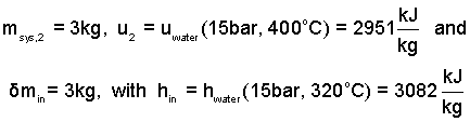 For equation (8) we have determined the values for the masses involved. Also we have the needed internal energy and enthalpy from property tables for water.