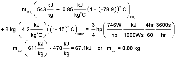 Finally, the heat term is always difficult to evaluate. Here we seek the least dry ice required which will correspond to the sum of heats ΣQ being zero. The next stage of our equation is: