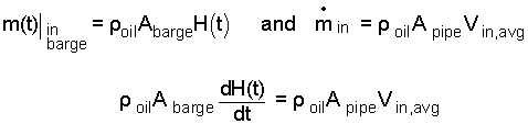 We developed this first order differential equation because some readers might not be familiar with it. The mass flow across the system boundary, m-dotin, equals the oil density time pipe area times flow speed. We now use constant hold geometry ( Abarge ) and constant density of oil to change the equation variable from mass to depth of oil, H(t).