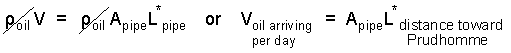 Put in a different way, right now, at the time t = 0+, way upstream at some unknown distance, L*, toward Prudehome, a drop of oil is moving toward us with constant speed. That drop will pass here in precisely 24 hours. Also, at that time, the "entire mass" of oil contained by the pipe between here and the "drop" will have passed this location. We know the volume of that "entire mass" and we know diameter of its pipe. We use these facts to calculate the distance or length of the system of oil, L*.