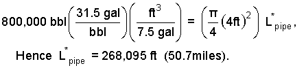 The volume of oil arriving per day is 800,000 bbl (British barrel measure). The diameter of the pipe is four feet. and 1 = 31.5gal/bbl and 1= 7.5gallons/cu.ft.)