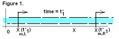 It is logical to identify a 1-D system as being that mass of fluid bounded by material coordinates ("m"). The "left" coordinate is notated "m,L" and "m,R" is the "right" coordinate. These coordinate points move in accord with the physics of the fluid. Assume the fluid incompressible and ideal; having no velocity profile (slug-flow). Let the selection of system occur at time "t*1".