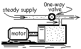 The schematic shows a piston/cylinder component of a hydraulic circuit. Normally the circuit operates at low-pressure. The piston is motionless and the cylinder contains its maximum volume of fluid. In this condition, hydraulic fluid pumped to the task bypasses the cylinder. Periodically, when extra "oomph" is needed, an electrical signal shuts the one-way valve and activates the motor to drive the piston to the right.