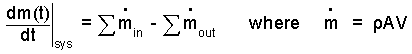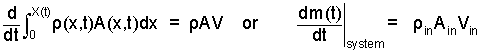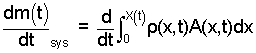 For our simple case, ρ and A being constant, we could just remove them from the integral and integrate it. But for the sake of learning, we pretend they are not constants. We rewrite the integral (with those terms as variables) then take the derivative of the system mass with respect to time.