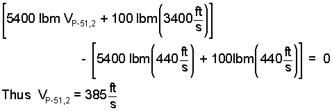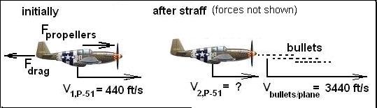 ♦ We take the system to be the mass of the P-51 and the mass of the ss1000 rounds of 50 cal bullets. The P-51 mass was about 5400 pounds. Its speed about 300 miles per hour (440 ft/s) when firing commenced. The bullet masses we take as 0.1 lbm. They left the machine gun muzzles at about 3000 feet per second. A simple, before-after sketch is helpful.