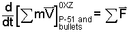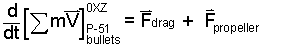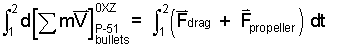 All Forces of the event are notated. You might wonder about the forces as the guns recoil. But the recoil effects are not forces since they do not occur at the system boundary. The bullets, powder and aircraft are all part of the system. Forces of the momentum equation are effects of the surroundings. To proceed toward solution of the first order differential equation, we separate variables then apply the integration operator:
