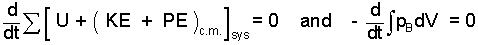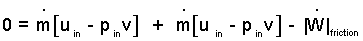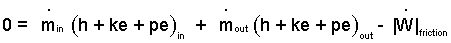 The resulting equation has four terms. Term (1) has the numeric value "0." The thermodynamic meaning of this "0" is the system energy is constant in time. Also and obviously, the "0" means the right-of-equality terms sum to zero. Terms (2) and (3) represent energy entering and leaving the pipe with the mass flow. More energy enters than leaves. Energy is dissipated frictionally (internal mechanical equilibration) as it flows.
