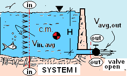 SYSTEM I: For this approach (sketched to the right) we select the water in the reservoir (at an instant in time) bounded by two imaginary, vertical and stationary planes. One plane is notated "in - in," the other as "out - out." These planes identify entrance and exit boundaries of our open system, respectively. The other boundaries of the water, its surface, the banks and the "water-side" surface of the dam, are natural; they don't move and water does not cross them. Below we apply the mass equation and energy equation to this system.