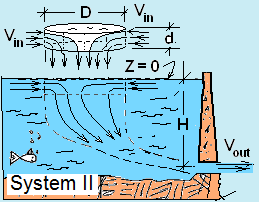 The "in" or System II is imagined to be a narrow annular area at the water surface and perpendicular to it. All of the water "in" enters the system passing through this thin, ribbon-like area which has a small dimension of depth, d and is circular with a great diameter,D. Consequences of the mass equation are the same as concluded for SYSTEM I.