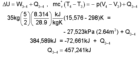 ♦ Heat of Lift: States (3) to (4) The volume of air will increase to 32.64m³ as the air pressure remains constant. Thus we know the conditions of State (4) (30kg, 32.64³, 27,523kPa and T = T4. We might calculate W3-4 independently. However let's apply the energy equation and obtain work and heat together.
