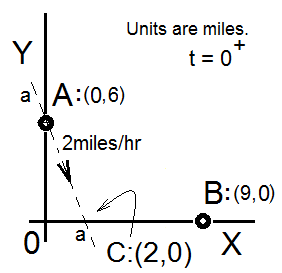 At time, t = 0+, a cart commences to move with a speed of 2miles per hr from point "A" down the line a - - a. Eventually moving point "A" will pass through point C thereafter to continue in a straight line.