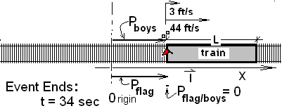 Event State upon Initiation: The sketch depicts the boys (moving with speed, 3 ft/s) with the train immediately abreast and moving past them. Its speed is 44 ft/s. This instant shown is the starting time of our event.